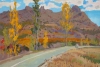 Olga Konorova's painting «There or from there?» is a picturesque autumn landscape filled with a philosophical subtext. At the center of the composition is a winding road running along golden autumn trees. Their bright yellow foliage stands out strikingly against the majestic brown-gray mountain slopes.