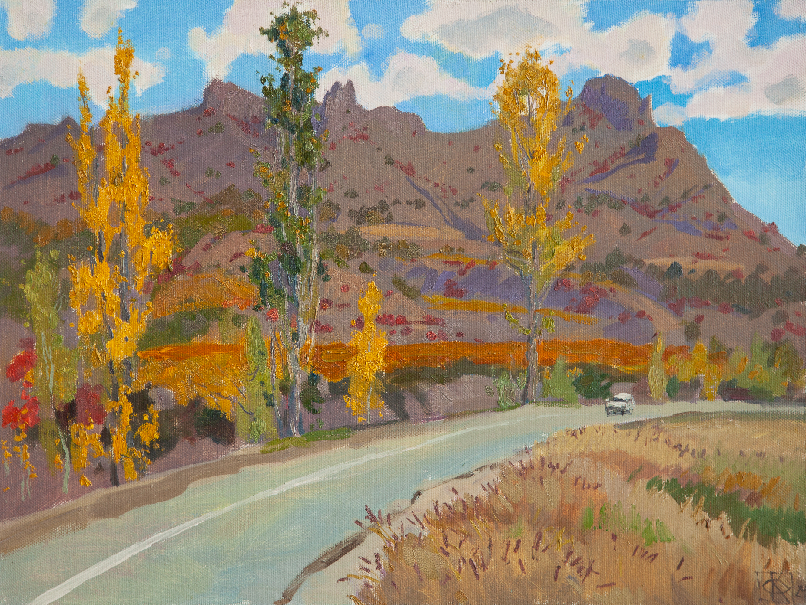 The road leading into the distance prompts the viewer to ponder: where is the lonely car, seen deep in the canvas, headed? Is it a journey toward something new or a path home? The sky, adorned with white cumulus clouds, adds light and dynamism to the painting. The artist masterfully works with color, conveying the warmth of autumn and the coolness of mountain air. «There or from there?» is a story about choice, searching for one's path, and how changeable nature is, just like human destinies, constantly moving between «here» and «there».