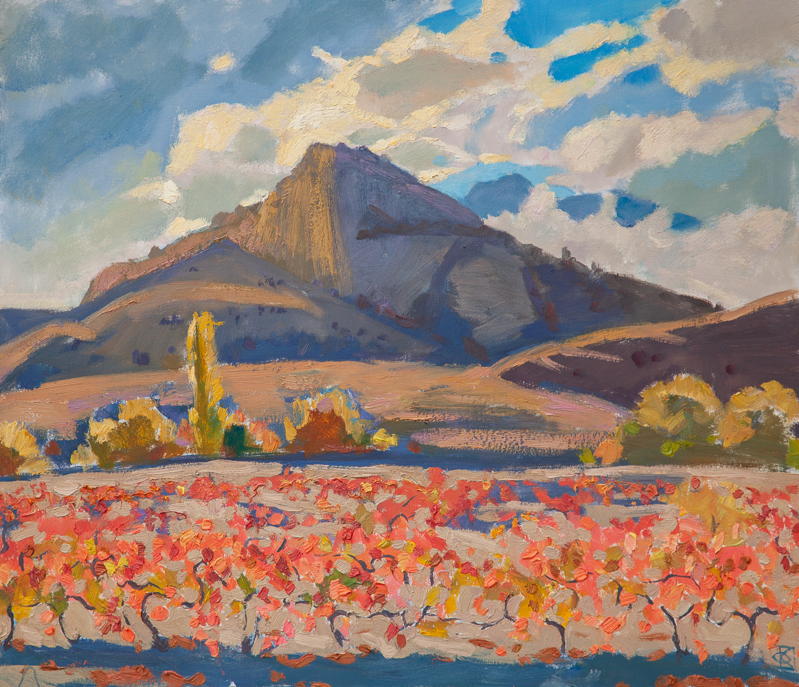 Картина Ольги Коноровой «Песни осени» – это живописное полотно, наполненное настроением поздней осени, когда урожай собран, а природа готовится к зиме. На переднем плане картины раскинулось виноградное поле, чьи лозы окрашены в яркие осенние оттенки: огненно-красные, золотистые и оранжевые. Эти цвета создают эффект пылающего ковра, контрастируя с более спокойными тонами окружающего пейзажа.