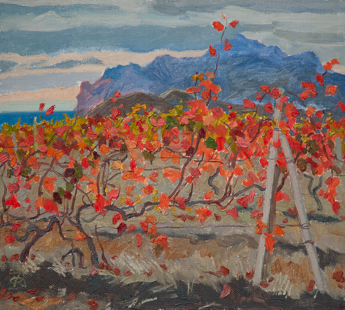 Картина Ольги Коноровой «Страна Коктебель» погружает зрителя в атмосферу осеннего Крыма, где краски природы приобретают особую яркость. На переднем плане раскинулся виноградник, его листва пылает всеми оттенками красного, оранжевого и жёлтого, создавая эффект пламени. Лозы, извилистые и крепкие, украшены этим золотым убранством, а деревянные подпорки служат им опорой, символизируя заботу и труд человека.