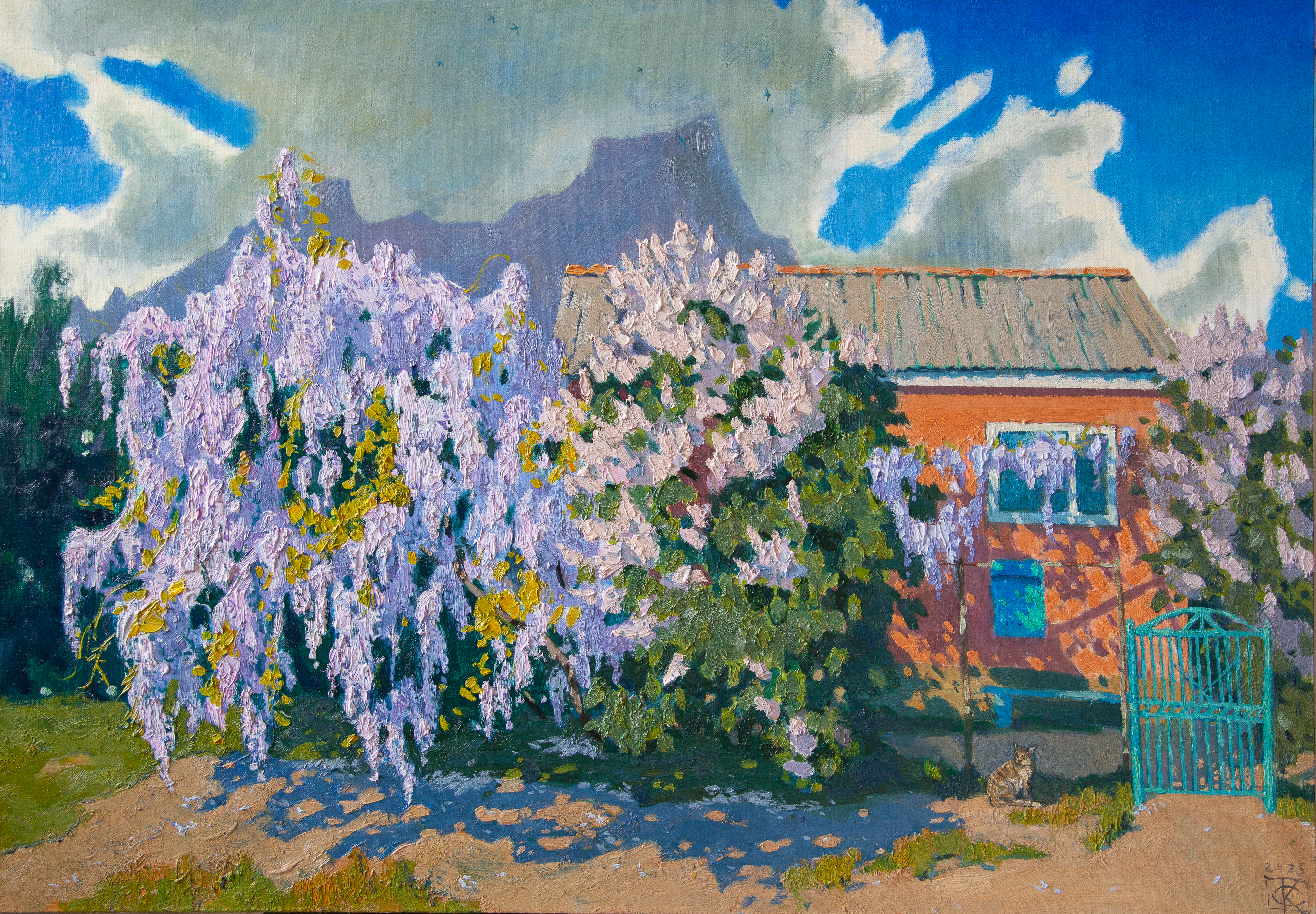 Against this magnificent backdrop, on the right by the house wall, a cat is nestled. Its presence adds liveliness and homely comfort to the painting, as if it is enjoying the beauty of the blooming garden. The sky above is changeable, with large white clouds through which bright blue patches peek, creating the impression of a clear but not hot day.