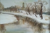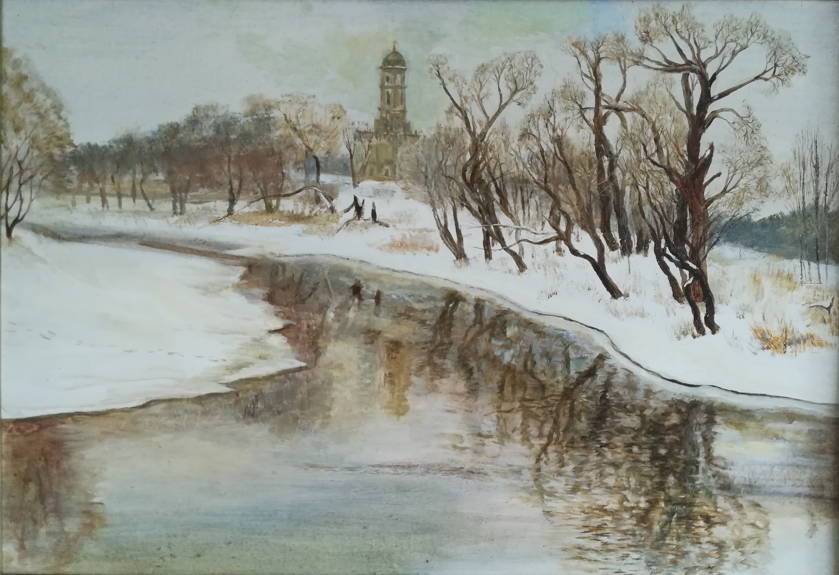 Elena Alenikova's painting «Temple in Dubrovitsy» is a delicate watercolor confession of love for Russian nature. The artist masterfully conveys the transitional state of winter, when the snow still covers the banks, but the river already breathes with anticipation of spring. The reflection of the majestic temple in the dark water creates an amazing effect of depth, connecting the earthly landscape with the reflected sky.