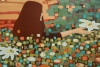 The background, executed in a technique reminiscent of mosaic or stained glass, consists of many multicolored squares and rectangles. Green, yellow, orange, blue, and red elements create the impression of a bright sunny day filled with life. The white flowers the woman is gathering seem to be the central element of the composition, attracting attention with their purity and tenderness.