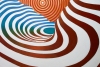 The composition is built on a combination of contrasting color elements and geometric shapes. In the center is a swirl of concentric circles in orange and yellow hues, creating a sense of movement and rotation. These circles draw the eye like a pulsating sun or a cosmic phenomenon.
