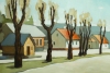 In the foreground is a row of trees, their dark trunks contrasting with the delicate, barely emerging foliage. They are arranged in a rhythmic sequence, creating a sense of movement and perspective.