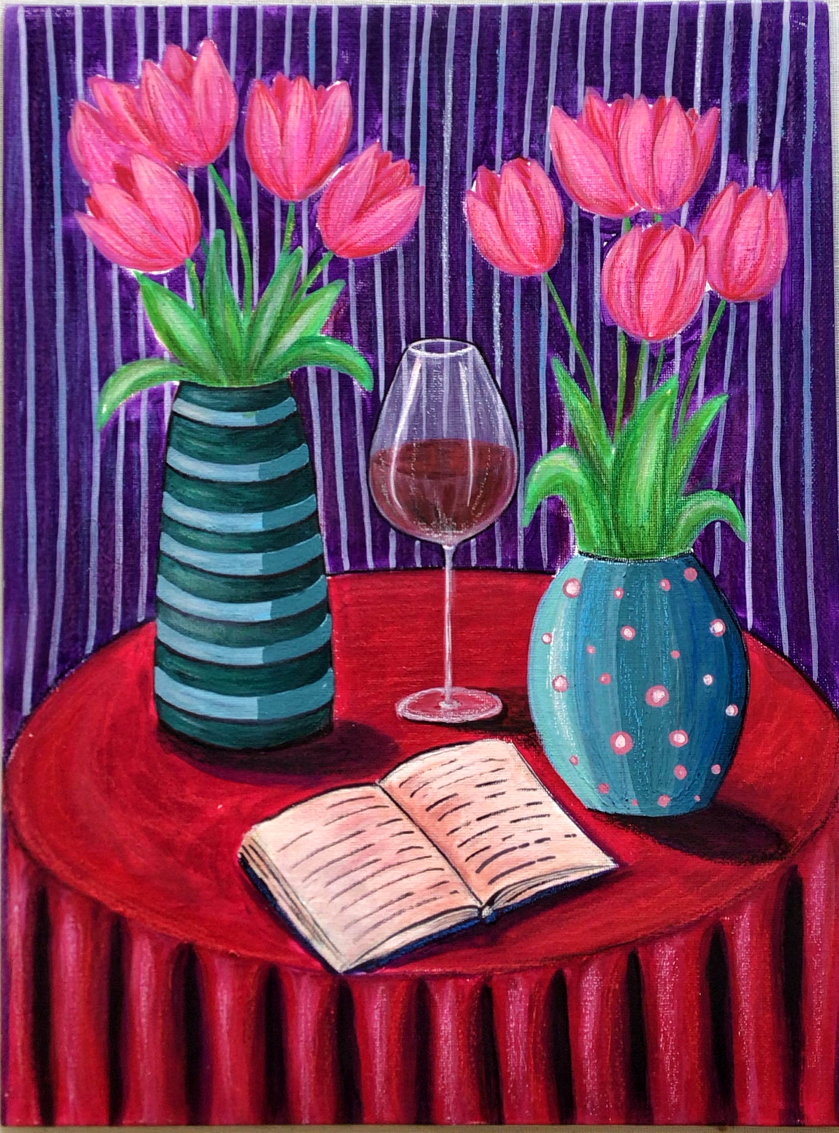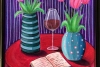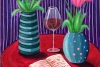 В итоге «Вечер пятницы» — это гимн гармонии контрастов: высокая и пузатая вазы, строгая полоска и задорный горошек, страстный цвет скатерти и нежность тюльпанов, вино и стихи. Всё вместе создаёт идеальный образ для неторопливого, наполненного красотой вечера.