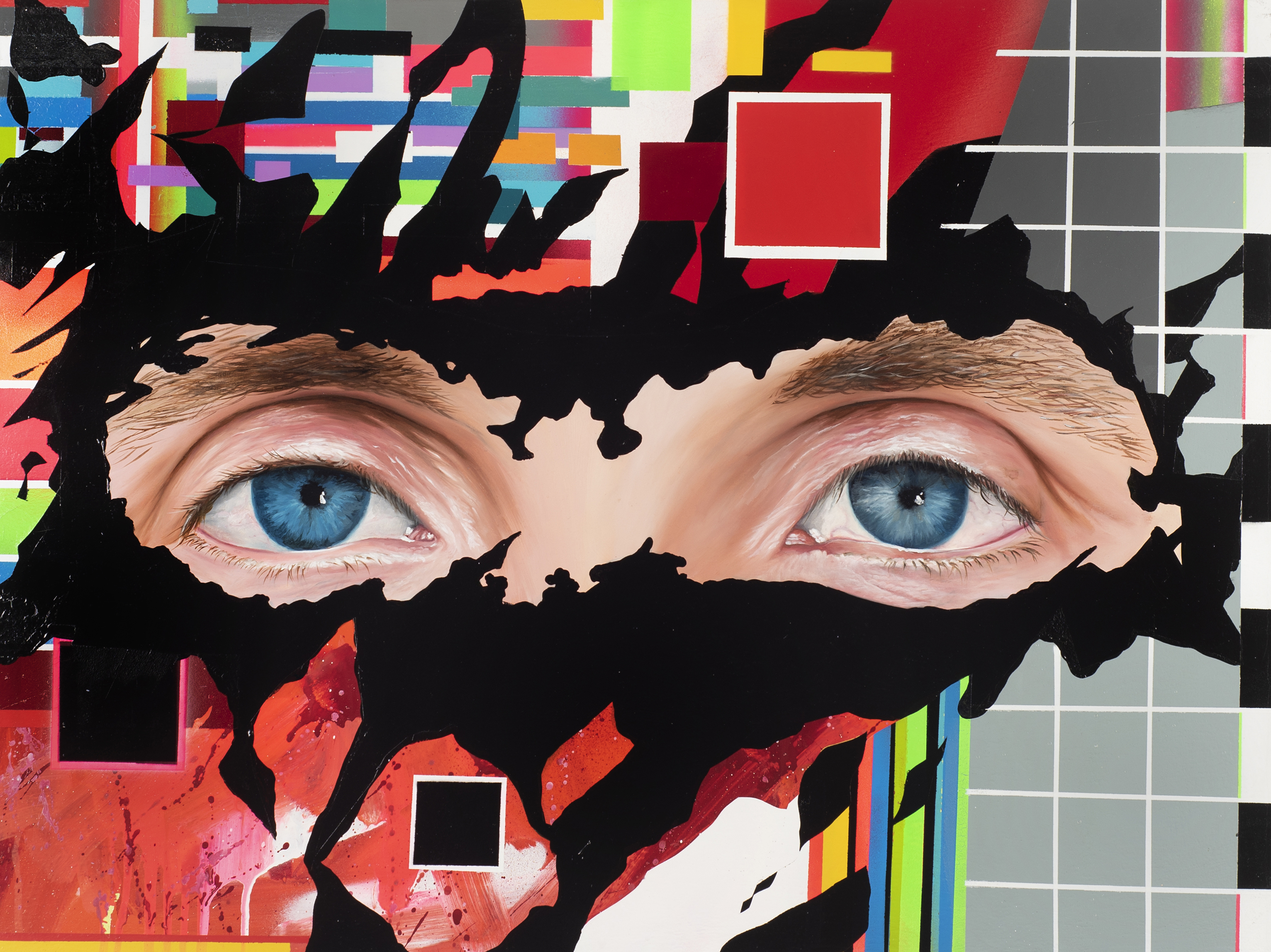 At the center of the composition are the eyes. Not as a portrait detail, but as a symbol of the main channel of perception for the modern person. Through the gaze, terabytes of visual content, informational noise, and digital images pass daily, subtly shaping thinking, reactions, and the state of consciousness.