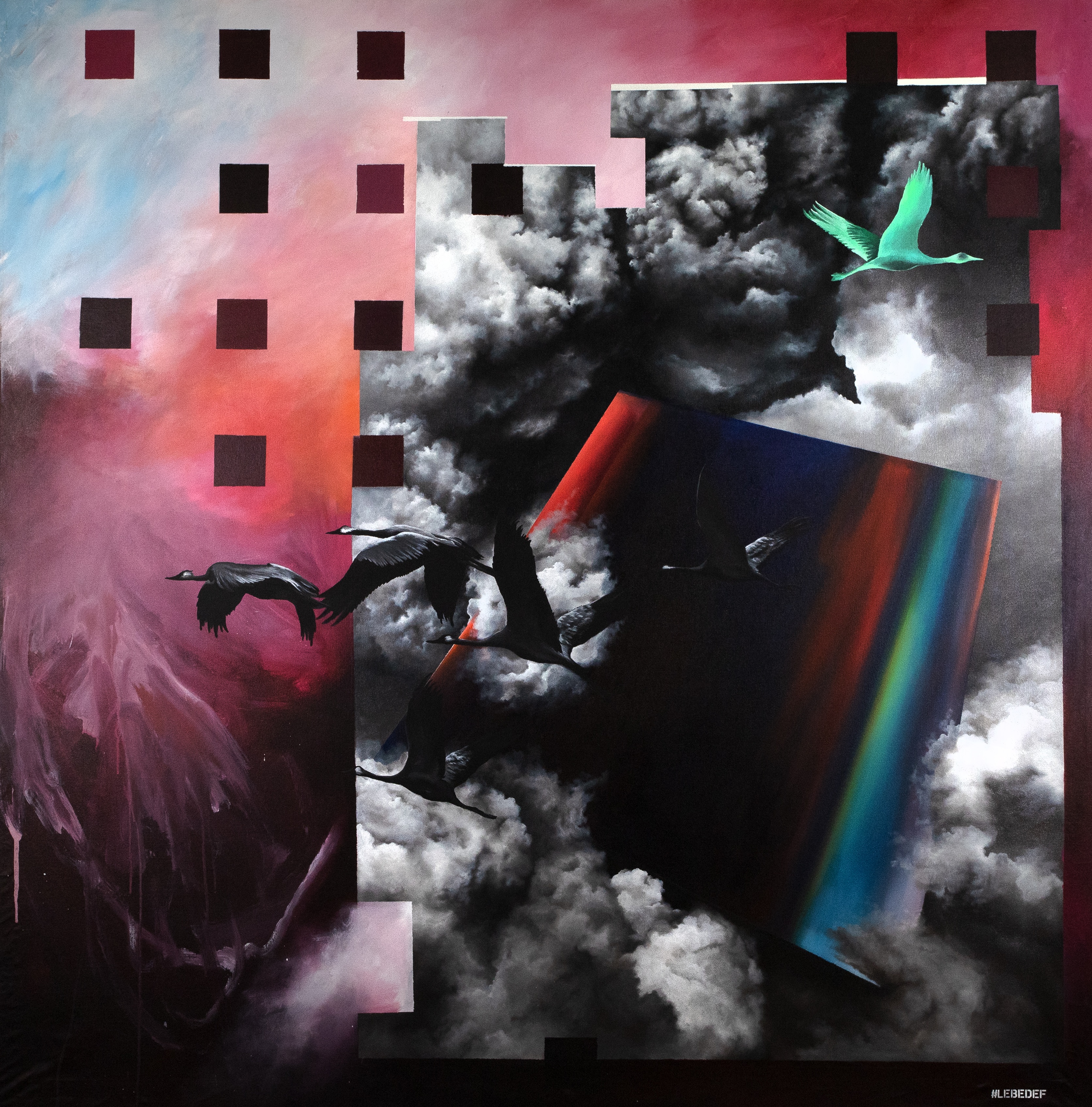 Контраст чёрно-белой стаи и яркого цветового акцента поднимает ещё один важный пласт: мир сам по себе нейтрален, почти монохромен. Цвет появляется не в реальности, а в сознании. Именно наше восприятие, наш опыт и смелость быть собой окрашивают происходящее. Художник словно задаёт вопрос: если реальность допускает цвет, почему бы не выбрать собственную палитру?