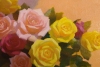 The focus is on a lush bouquet of roses in various shades: soft pink, creamy, bright yellow, and deep red. Sidorenko masterfully captures the texture of the petals, their velvety softness and translucency, emphasizing the play of light that seems to pass through them, creating a sense of inner glow. The colors smoothly blend into each other, creating harmonious combinations.