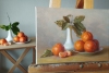 Sidorenko skillfully conveys the play of light on the smooth surface of the fruits and the roughness of the leaves. Soft shadows cast by the objects create a sense of volume and depth. The background, rendered in muted pastel tones, highlights the brightness of the mandarins and gives the painting a feeling of calm and tranquility.