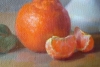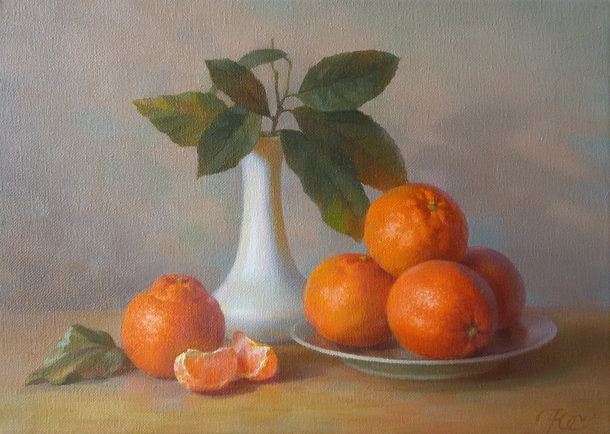 The central element of the composition is a vase with several branches bearing dark green leaves. In front of the vase lies a pile of ripe juicy mandarins, whose bright orange color creates a festive mood. One mandarin is cut open, revealing its juicy pulp and segments, which adds appetizing and natural qualities to the painting.