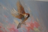 The central focus is a dynamic composition where bright red and green fragments of the watermelon fly in different directions like shards of a planet. This explosion is full of juiciness and vitality, energy and motion. In the sky, among the flying pieces, a small sparrow hovers — a symbol of hope, freedom, and perhaps the fragility of life that exists against the backdrop of grand events.