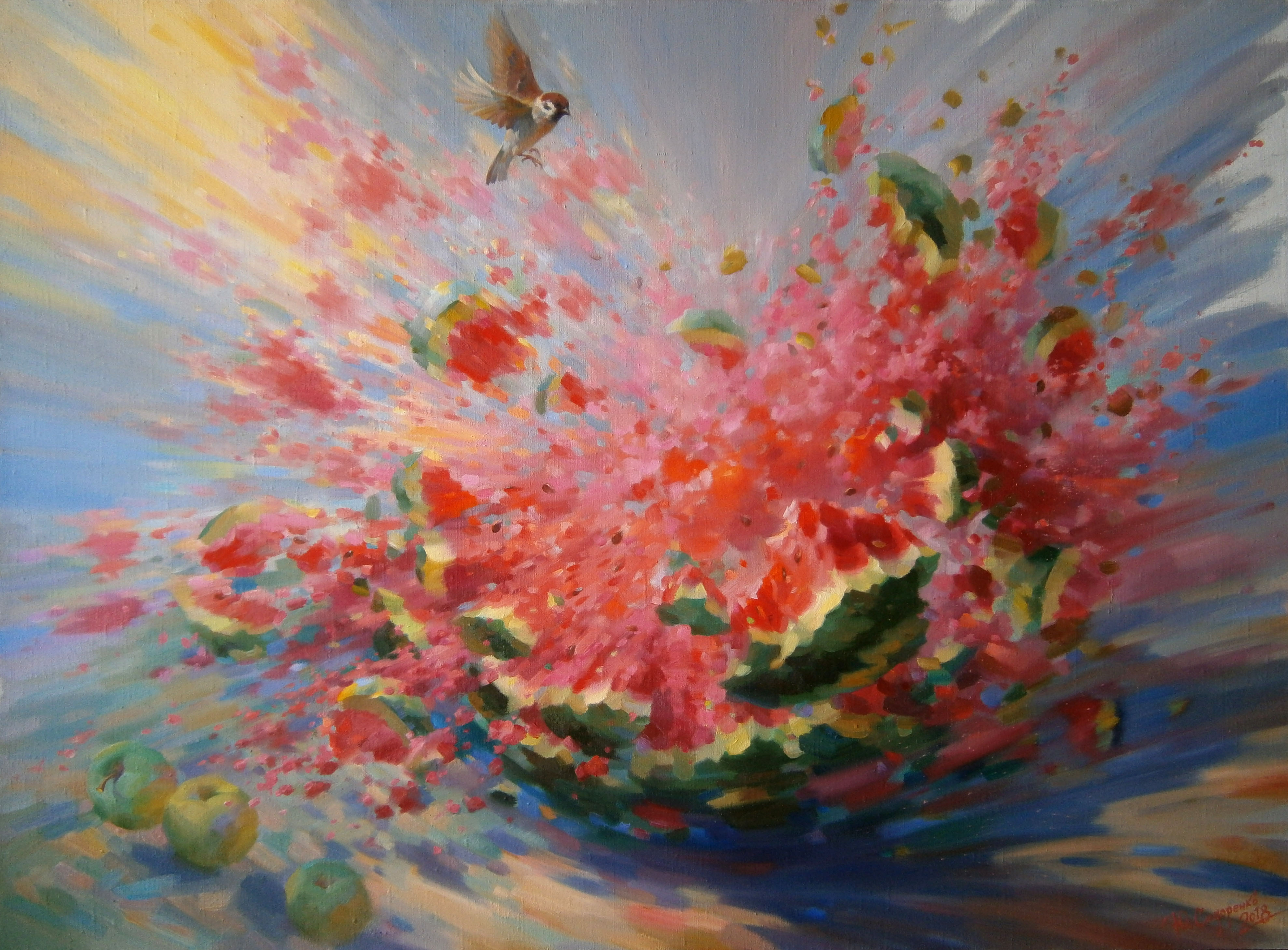 The painting «Watermelon Allegory» by Yuri Sidorenko is an explosion of color and emotions, a metaphorical depiction of life filled with movement, joy, and perhaps unexpected changes. The artist captures the moment when the watermelon literally bursts into pieces, creating the effect of a grand cosmic explosion.