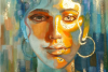 The painting style combines clear facial features with a blurred mosaic background made up of rhythmic brushstrokes. This technique creates the effect of a «shimmering» night space. The painting breathes mystery and melancholy, turning the portrait into a profound emotional story about light in darkness.