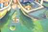 Anna Dauetas's painting «Three boats» is a vivid and lively depiction of port life, featuring three vessels against a backdrop of emerald-green water. The artist uses bold strokes and pure, saturated colors in her distinctive style to convey the atmosphere of a sunny day and sea breeze.