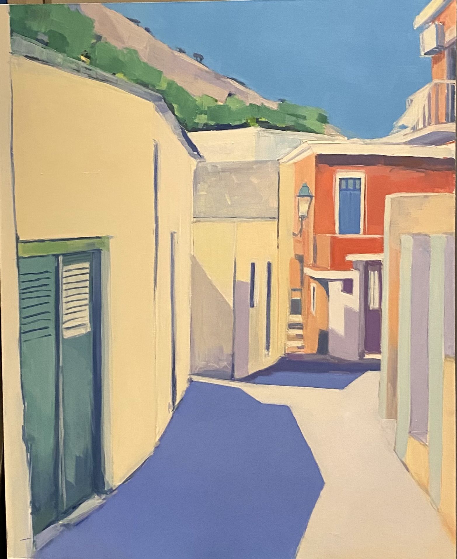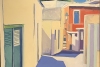 The artist employs a concise approach, reducing forms to clear planes. Blue accents on the shutters and deep violet shadows on the pavement create the sensation of bright midday sun. The greenery in the background harmoniously complements the palette, giving the composition completeness.