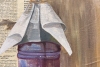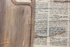 The textured background is made using an authentic Georgian newspaper, which became part of the artistic foundation of the work. The newspaper is fixed and covered with several layers of protective varnish, after which acrylic painting is applied on top.