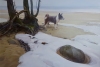 The painting by Vladimir Skrynnikov «Stone, tree, dog» is a poignant piece imbued with a sense of calm contemplation and gentle melancholy. The artist masterfully conveys the transitional state of nature — that very moment when spring has not yet taken hold, and winter has already begun to retreat, revealing damp sand and snow that has not yet melted.
