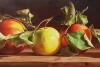 At the center of the composition are ripe apples, freshly picked from the branch. Their smooth skin, barely noticeable imperfections, and slightly wilted, dry leaves that still retain traces of life energy are rendered with astonishing realism. The light softly gliding over the fruits emphasizes their roundness and juiciness, creating the sensation that the aroma of apples fills the entire space. The wooden surface on which the fruits lie adds naturalness and warmth to the work.