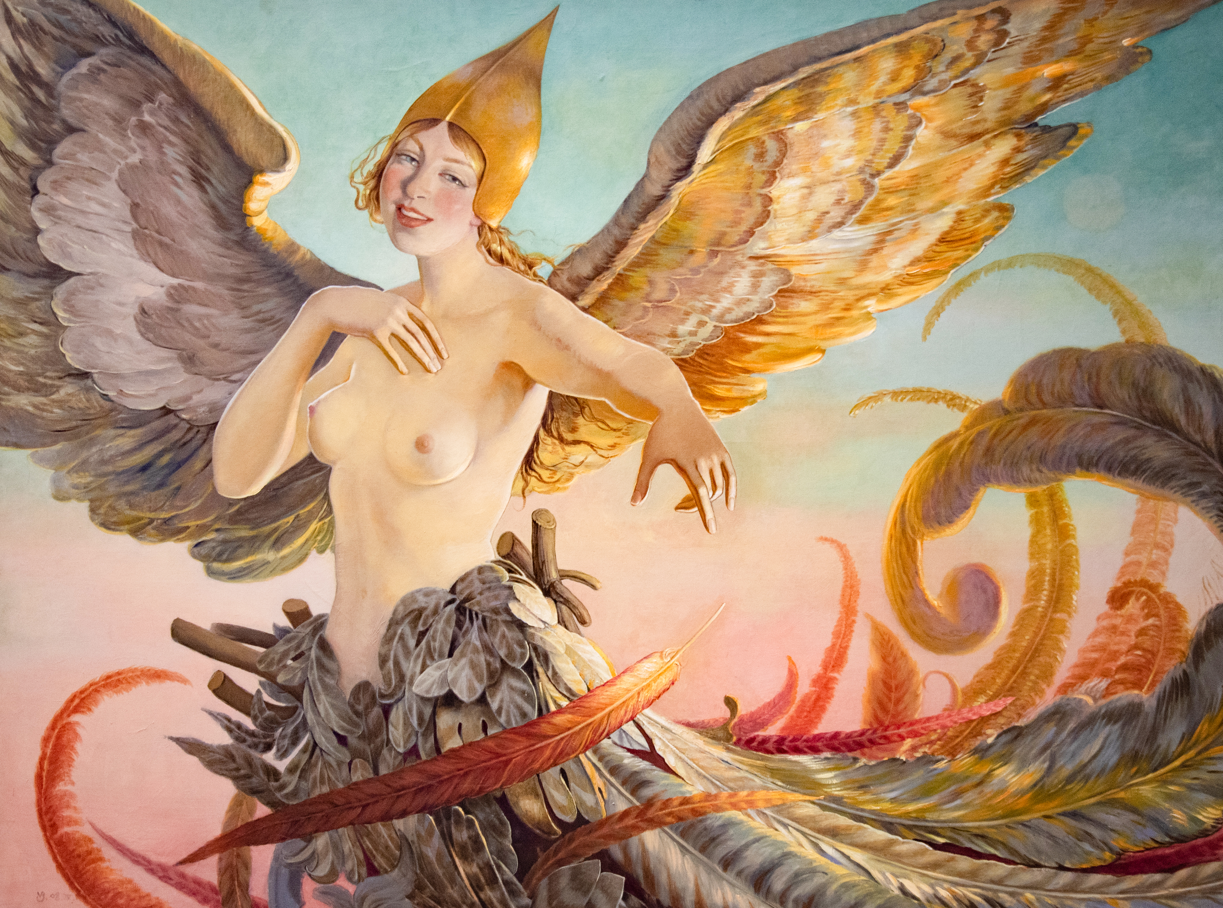 At the center of the canvas is a graceful heroine whose enormous wings, shimmering with golden and ochre hues, seem to be an extension of her being. Instead of the usual plumage, her outfit is woven from numerous feathers, creating the effect of a fairy-tale costume. The golden headdress, reminiscent of a helmet, adds a touch of ancient grandeur to the image.