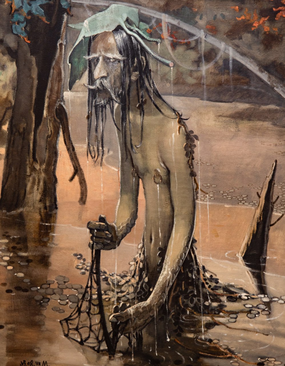 The canvas depicts an ancient water spirit covered with algae. His figure, half-hidden in murky water, seems to be part of the landscape. Long tangled hair and beard, covered with moisture, emphasize his inseparable connection with the river or lake. The expression on his face is melancholic, tired, yet filled with deep wisdom and understanding of the secrets of the aquatic world.