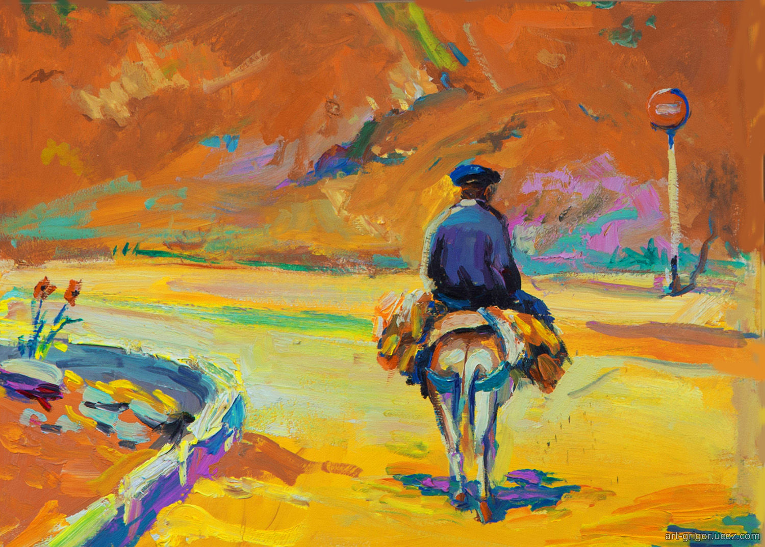 The painting by Vladimir Grigoryan «Sunny day, pilgrim on a donkey» is a vivid, almost meditative canvas that immerses the viewer in an atmosphere of eternity and an endless journey. The artist uses an expressive painting language, where rich, warm shades of orange and yellow convey not just a scorching day, but the very feeling of sunlit space. The figure of the pilgrim on the donkey, moving into the distance, becomes a symbol of human wandering, solitary yet filled with meaning.