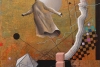 The artist juxtaposes the incompatible: the organic form of a ghost and strict geometric objects — prisms, cubes, a chessboard grid. These elements create a sense of an «intellectual puzzle» where each object has its own code. The golden-ochre background gives the work an archaic tone, as if the action takes place outside of time.