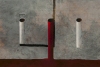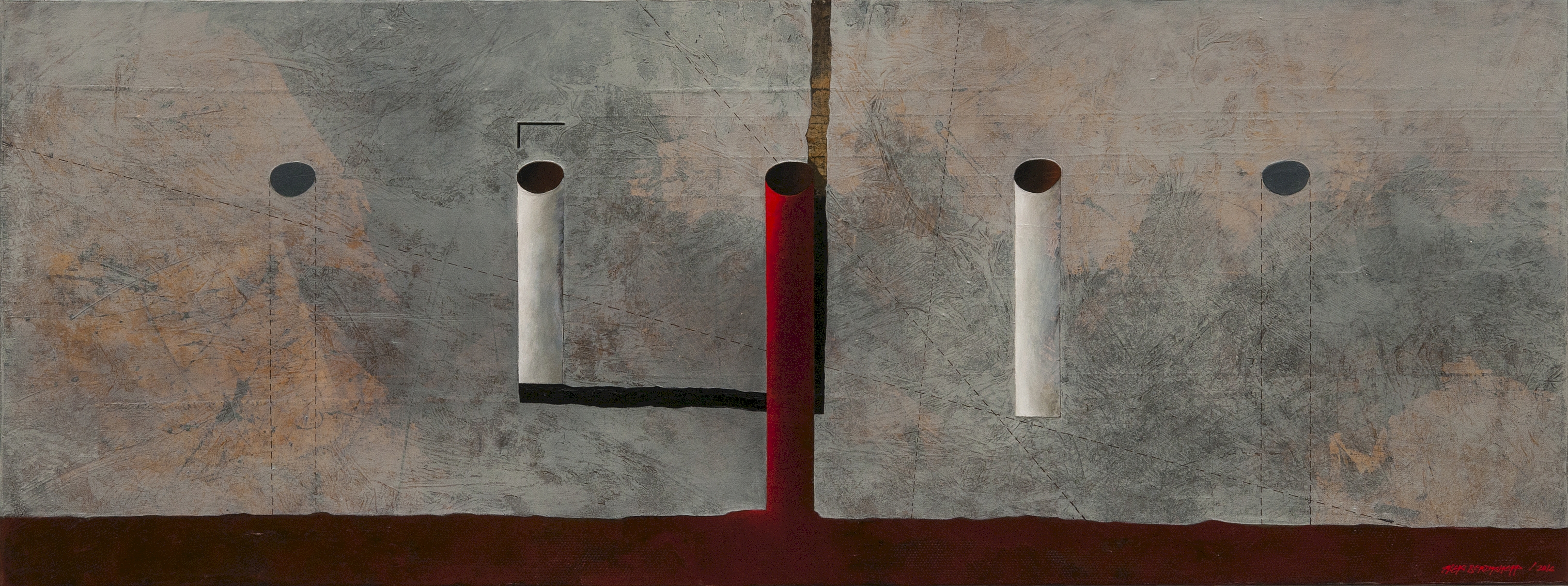 On the gray, time-worn «wall» are cylindrical elements. The central red pipe is the only bright accent; its vertical line pierces the entire composition, creating powerful tension. The other «holes» or columns merely hint at their presence, creating a feeling of emptiness and anticipation.