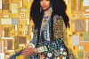 Это яркое произведение современного искусства, изображающее прекрасную молодую чернокожую женщину, сидящую с тихим достоинством. Её руки изящно сложены на коленях. Она царственна и излучает спокойную уверенность, которая захватывает внимание зрителя и приглашает к более глубокому созерцанию.