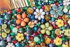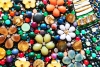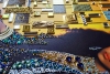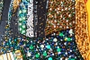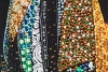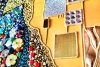 Платье девушки щедро украшено мозаикой из полудрагоценных камней (сердолик, нефрит, агат, аметист, амазонит, розовый кварц, халцедон, лунный камень, аквамарин, малахит, бирюза) и стразами. Яркие цветочные мотивы, мерцающие бусины и орнаменты создают поразительную игру цвета и текстуры, отражая культурное богатство и женственность.
