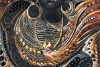 The background of the painting comes alive in a whirl of stylized waves and curls, executed in a rich palette of brown, gold, gray, beige, and black shades. These flowing lines, like a dance of spirits, envelop the figure of the shaman, giving the composition a mesmerizing dynamic and decorative quality.