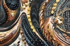 The neck and shoulders are adorned with numerous necklaces. Here intertwine the warm shades of tiger's eye, deep gray variscite, the contrast of agates and onyx, the sunlight of amber, the shine of mother-of-pearl, golden sparkles of aventurine, and earthy tones of jasper. Special attention is drawn to the massive gold necklace crowned with a large pendant made of natural amber, as if holding a piece of the ancient sun within.
