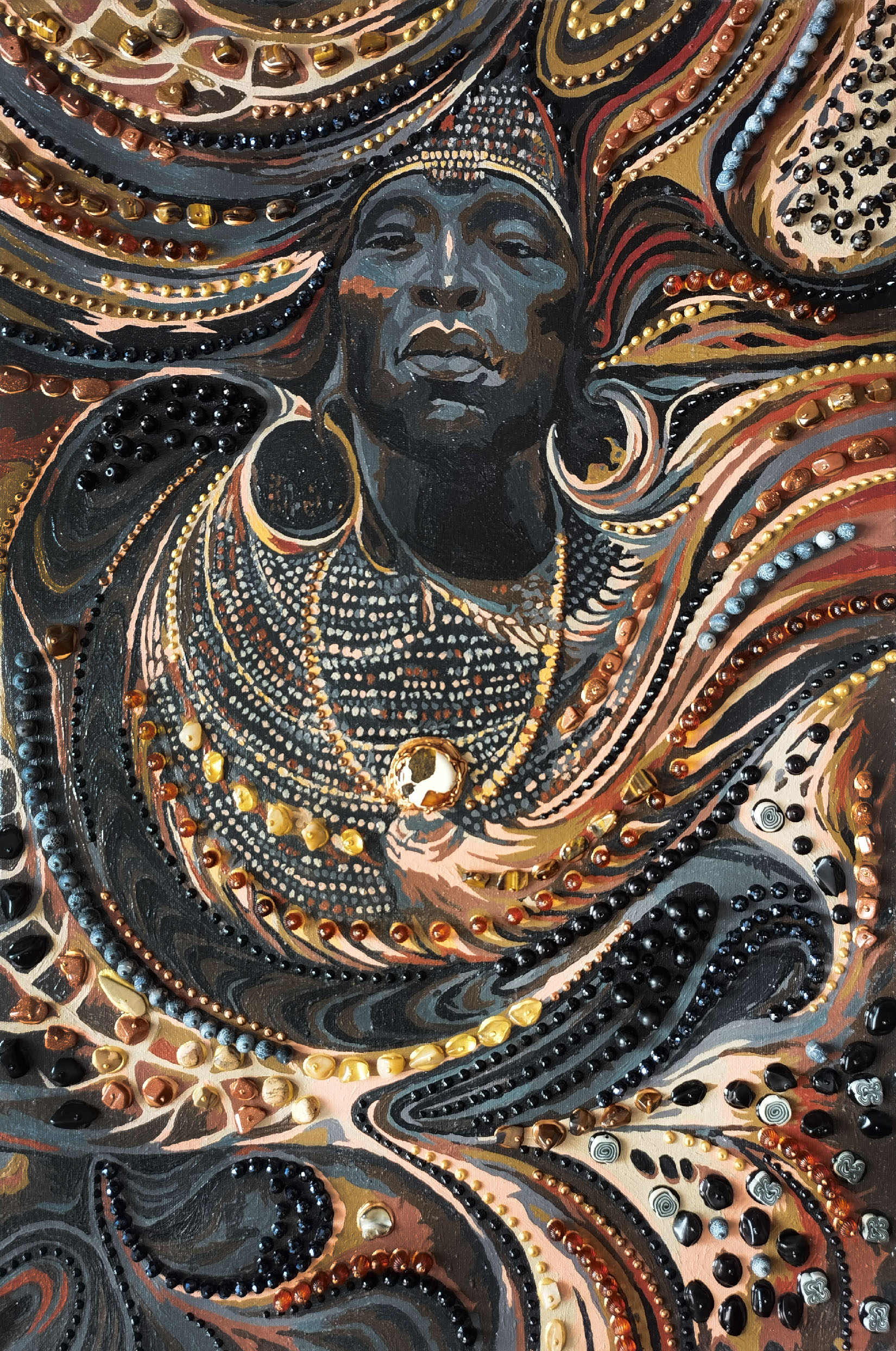 The technique of execution, where painting is skillfully combined with inlay, creates an amazing texture and volume. Every bead, every stone, every detail is worked out with incredible meticulousness, intertwining into a single whole filled with richness and depth.
