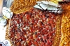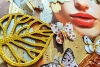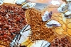 Произведение создано акриловыми красками на холсте, щедро украшено фактурными элементами. Изысканные золотые пионы, объёмные листья с полудрагоценными камнями сердолика, зеркальные фрагменты, металлические орнаменты и рельефные узоры придают поверхности многомерность и ощущение изысканной роскоши. Бабочки, расположенные слоями, создают утончённый трёхмерный эффект. Кристальные стразы и металлические текстуры усиливают общее сияние, добавляя работе изящного блеска.