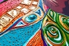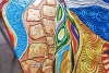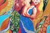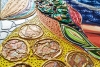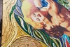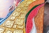 Яркая геометрия золотых квадратов, выполненных из блестящего сусального золота, соседствует с калейдоскопом многоцветных кругов и изящных бронзовых спиралей. Всё это создаёт атмосферу роскоши и богатства, где каждый элемент излучает утончённость.