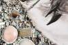 Фон картины — это богатство цвета и текстуры, созданное мозаикой из лунного камня, агата, розового кварца, яшмы, аметиста, амазонита, оникса, чароита, кахолонга, аквамарина и кошачьего глаза. Каждый камень с его уникальным оттенком и узором вносит вклад в создание завораживающей глубины и контраста.