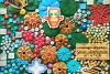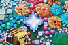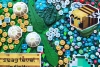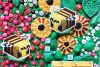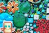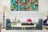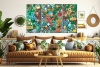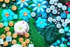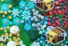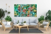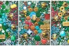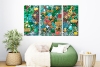 Каждая часть работы наполнена сложными текстурами и множеством деталей: объёмные элементы, мозаичные структуры, декоративные вставки и ритмичные композиционные акценты создают ощущение глубины и тактильного богатства. Яркая цветовая палитра — насыщенные зелёные, бирюзовые, коралловые и золотистые оттенки — формирует живую, энергичную атмосферу, привлекающую взгляд.