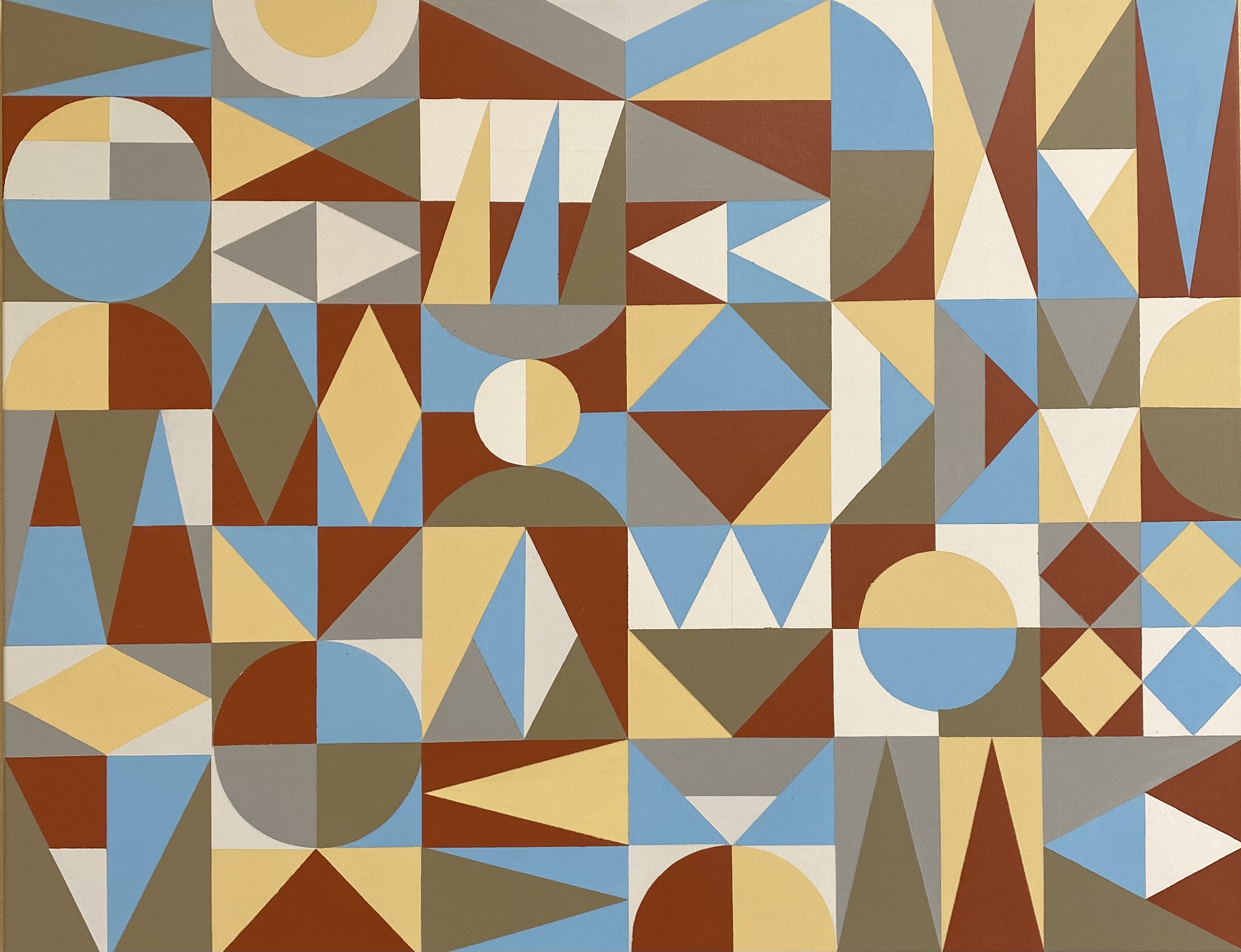 This artwork represents a cohesive structure of interaction between form and color, creating a sense of balance and movement. The use of contrasting colors enhances visual intensity, drawing attention to the intricate balance between simplicity and complexity. It is a masterful combination of precision and creativity, offering a visually stimulating experience that confidently and intuitively reflects the essence of abstract modernism.