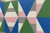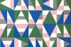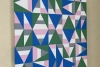 This artwork is a vivid example of geometric abstraction, characterized by a dynamic interplay of shapes and colors. The composition is carefully structured using a grid of triangles and rectangles, predominantly in shades of green, blue, pink, gray, and white. Each shape fits organically into the grid, creating a harmonious yet vibrant pattern that captivates the viewer. The use of alternating colors introduces rhythm and movement, while the symmetrical arrangement establishes balance. Subtle variations in the shades of similar forms add depth, drawing the viewer’s eye to explore the entire piece. This artwork is distinguished by the precision and skillful use of basic geometric forms by the artist, creating an aesthetic impression that is both contemporary and timeless.
