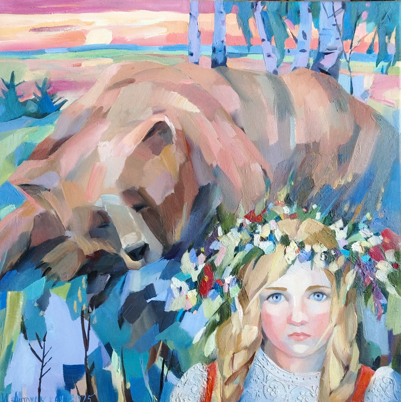 Irina Antonovskaya's painting «Masha and the Bear» is a vivid and fairy-tale interpretation of a famous Russian folk tale, filled with warmth, color, and emotion. The artist creates an image where childlike innocence meets the power of nature.