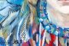 Крылья Сирин, выполненные в синих и бирюзовых тонах, занимают значительную часть холста. Они написаны широкими, динамичными мазками, создающими ощущение полёта и мощи. Головной убор, украшенный узорами, придаёт образу царственность и сказочность.
