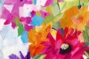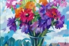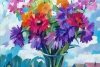 At the center of the canvas is a lush bouquet arranged in a glass vase. It features a variety of summer flowers: bright red, pink, purple, yellow, and orange. The flowers are painted with bold, expressive strokes that convey their texture and volume. Particularly striking are the large, fully opened buds, as if filled with sunlight. Green leaves and stems add depth and contrast to the painting, emphasizing the brightness of the flowers.