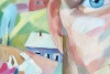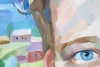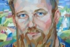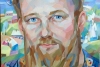 At the center of the composition is the man's face, his piercing blue eyes looking directly at the viewer, creating a sense of direct contact and dialogue. The facial features are painted with bold geometric strokes, combining warm earthy tones with cool blues and greens, giving the portrait liveliness and realism. A thick reddish beard and mustache emphasize masculinity and character.