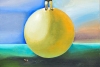 Behind the sphere is a sharp division of space: on the left is a calm blue sky, on the right are darker, more dramatic tones. This contrast may symbolize a choice of path, inner struggle, or interaction with different aspects of reality. Below, on the green surface, lies a small spiral figure resembling a shell or worm, which seems to "flow" against the general movement, possibly symbolizing another, slower or more independent form of existence.