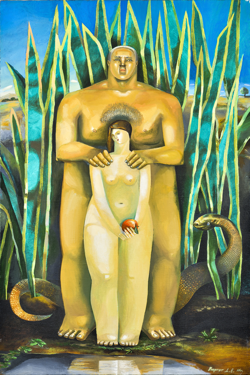 Картина «Адам и Ева» Дениса Варгота — это переосмысление библейского сюжета в экспрессивной, символической манере. Стиль художника сочетает в себе элементы сюрреализма, примитивизма и символизма, создавая образы, выходящие за рамки традиционного изображения.
