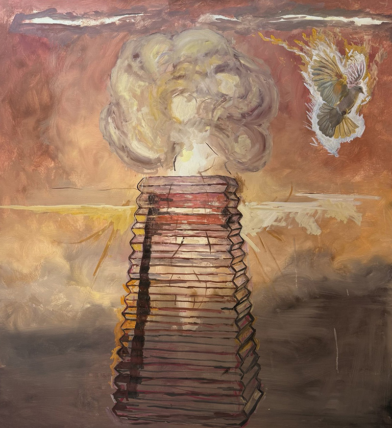 В центре картины – голубь мира. Он пытается улететь, но падает, сгорая. Этот символ, некогда олицетворявший надежду и мир, находится на грани уничтожения. Ведь «Вместе мы сильны» – но теперь мы настолько сильны, что готовы уничтожить себя.